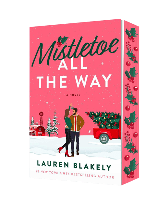 From #1 New York Times bestselling author Lauren Blakely, comes a spicy, standalone holiday romance, MISTLETOE ALL THE WAY! This steamy, small town, grumpy/sunshine, forced proximity, opposites attract holiday romance features a grinchy cowboy vet and the jolliest publicist as they tackle the town’s latest Christmas competition together! Releasing October 6th in all formats, including this stunning paperback with beautiful mistletoe and holly sprayed edges. Check out the cover and pre-order your copy today!
