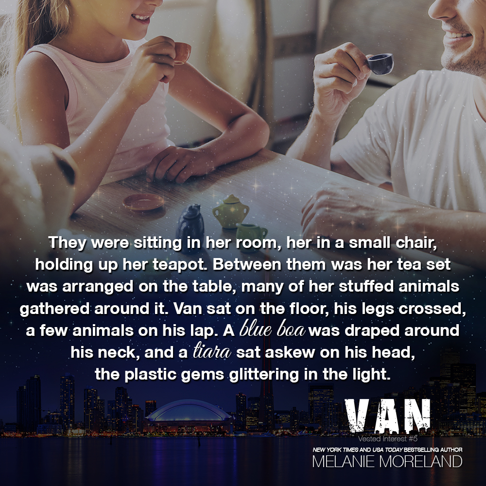 Van sat on the floor, his legs crossed, a few animals on his lap. A blue boa was draped around his neck, and a tiara sat askew on his head, the plastic gems glittering in the light. He held out his cup, his pinkie extended, no doubt having been schooled in proper tea party etiquette by Sammy, murmuring his thanks for more “tea.”