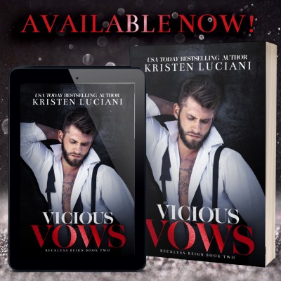 VICIOUS VOWS, the second book in the RECKLESS REIGN series by USA Today Bestselling author Kristen Luciani, is an enemies-to-lovers arranged marriage dark mafia romance. This epic saga follows one couple through a steamy, pulse-pounding trilogy with a guaranteed HEA in book three. It is not a standalone.