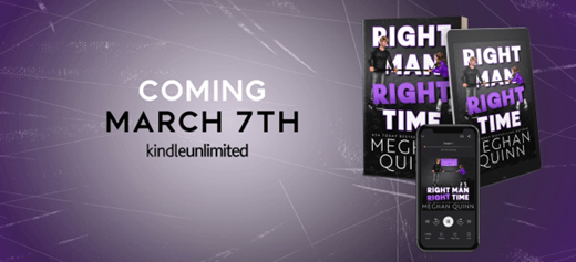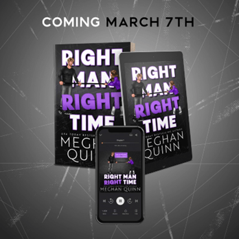 About RIGHT MAN, RIGHT TIME (Coming 3/7/2023):From USA Today and Amazon Charts bestselling author Meghan Quinn, comes a new fake dating, standalone sports romance featuring the hockey men you can’t get enough of and love. This steamy, age-gap romantic comedy will bring all the laughs while making your cheeks blush at the same time.Running into your ex is never ideal. Running into your ex who is now dating your nemesis is a literal nightmare.That’s how I found myself in a sheer panic, reaching for the closest guy at the bar and kissing him. And to my delight he was easily the most attractive man I’ve ever seen.The only problem is, when I tried to walk away after thanking him for his help, he stopped me with three life-changing words . . .“You owe me.”That’s how I found myself, a college girl, in a fake relationship with a professional hockey player ten years older than me.At first it was easy. He helped me with my internship. I helped keep his ex away from him. We were becoming fast friends.It wasn’t until he started staying the night at my dorm did the rules of our arrangement become complicated.Now my feelings are involved and even though I kissed the right man at the right time, I’m worried he’s just waiting for the clock to run out.PRE-ORDER YOUR COPY TODAY!https://mybook.to/RightManRightTime