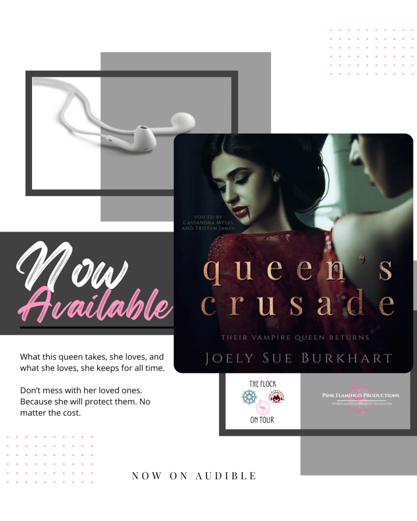 #NowLive #NewRelease #ReleaseBlitz #PinkFlamingoProductions #TheFlockonTour #QueensCrusadeAudioTour #JoelySueBurkhart #CassandraMyles #TristanJames #ParanormalRomance #VampireRomance #BisexualRomance #PolyamoryRomance