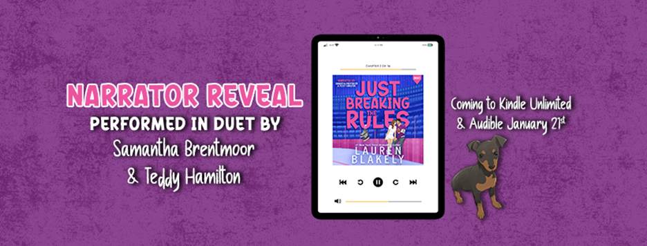 From #1 New York Times bestselling author Lauren Blakely, comes the first standalone hockey romance in her brand new Hockey Ever After series, JUST BREAKING THE RULES! Narrated in duet by Samantha Brentmoor and Teddy Hamilton, JUST BREAKING THE RULES is releasing January 21st in all formats, and will be free to read in Kindle Unlimited! But what’s better than duet narration? Duet narration performed live with the two narrators in studio together, which is exactly how this audiobook was recorded! This sexy, single dad, opposites attract hockey workplace romance answers the burning question — what happens when you open a small town bakery with your brother’s hockey star best friend? Listen and feel like you’re in the room where it happened with the narrators on January 21st to find out the answer!